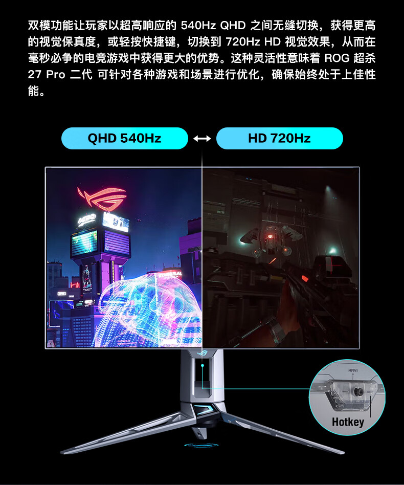 双模式 (QHD @ 540Hz, HD @ 720Hz), 0.02ms (GTG), G-SYNC