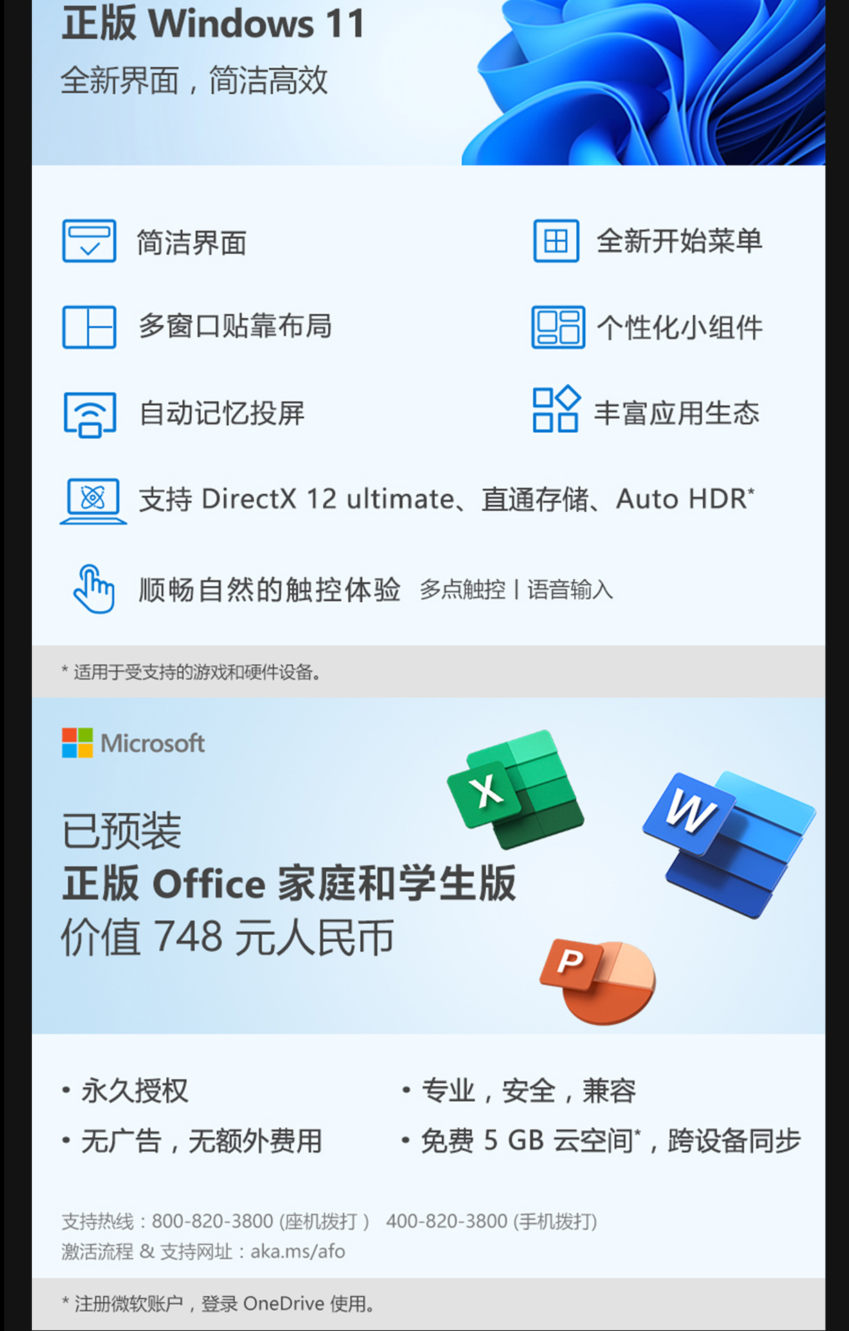 出厂预装: Windows 11家庭中文版(带正版Office)