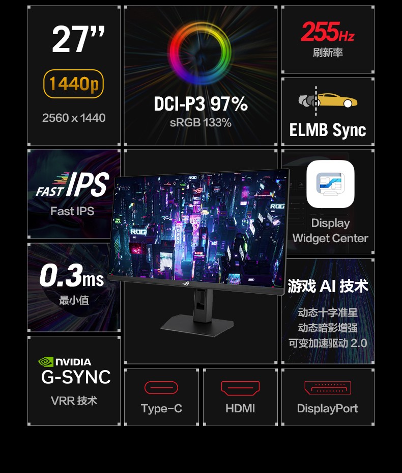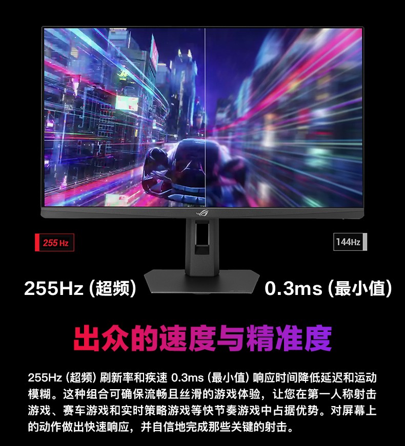 27 英寸 2560x1440, 255Hz OC (原生 240Hz), 0.3ms